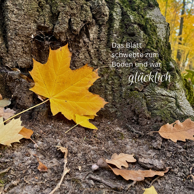 An diesem Tag wehte ein Wind, und nach einer Weile sah ich, wie das Blatt den Zweig verließ und freudig tanzend zum Boden schwebte, denn als es schwebte, sah es sich bereits wieder dort im Baum.